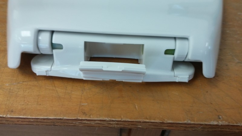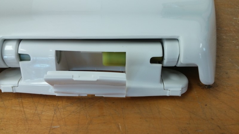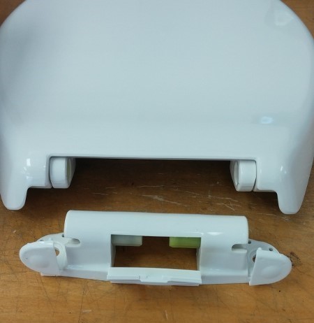 Step 3: Place the seat and lid portion onto the hinges and pop the pins into place (this can be a bit tricky... don't give up. You may need to wiggle and wobble the assembly slightly to "seat" them into place)