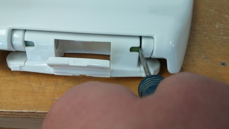 STEP 1: Remove the hinge from the seat & lid assembly. You will need to install the hinge onto the toilet first. Remove the hinge by taking a screw driver and carefully popping the locking pins away from the seat & lid.