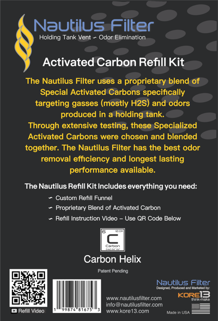 Using a proprietary blend of Specialized Activated Carbons specifically targeting gasses (mostly H2S) and odors produced in holding tanks, the Nautilus Vent Filter is the best for odor removal efficiency - and longest lasting performance available! Refill has more than enough to fill your vent filter completely. Get your refill today!